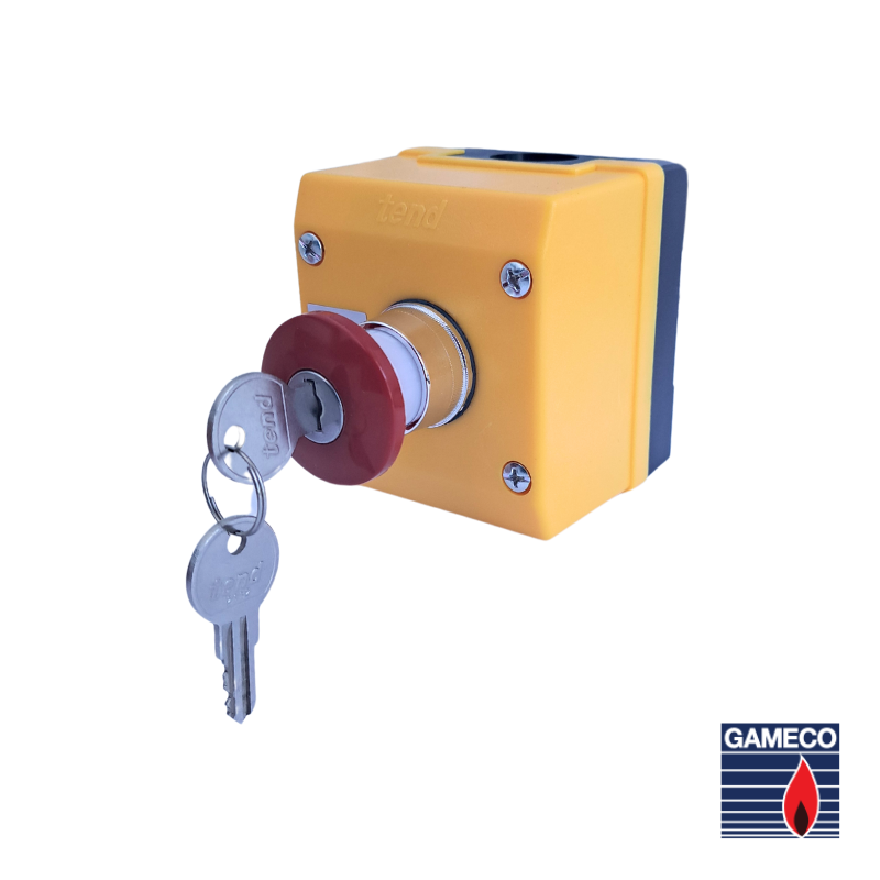 Pushing the button down opens up the curcuit and closes a Solenoid. Key Lock adds extra protection, so that only those with the key can release the Emergency stop button.